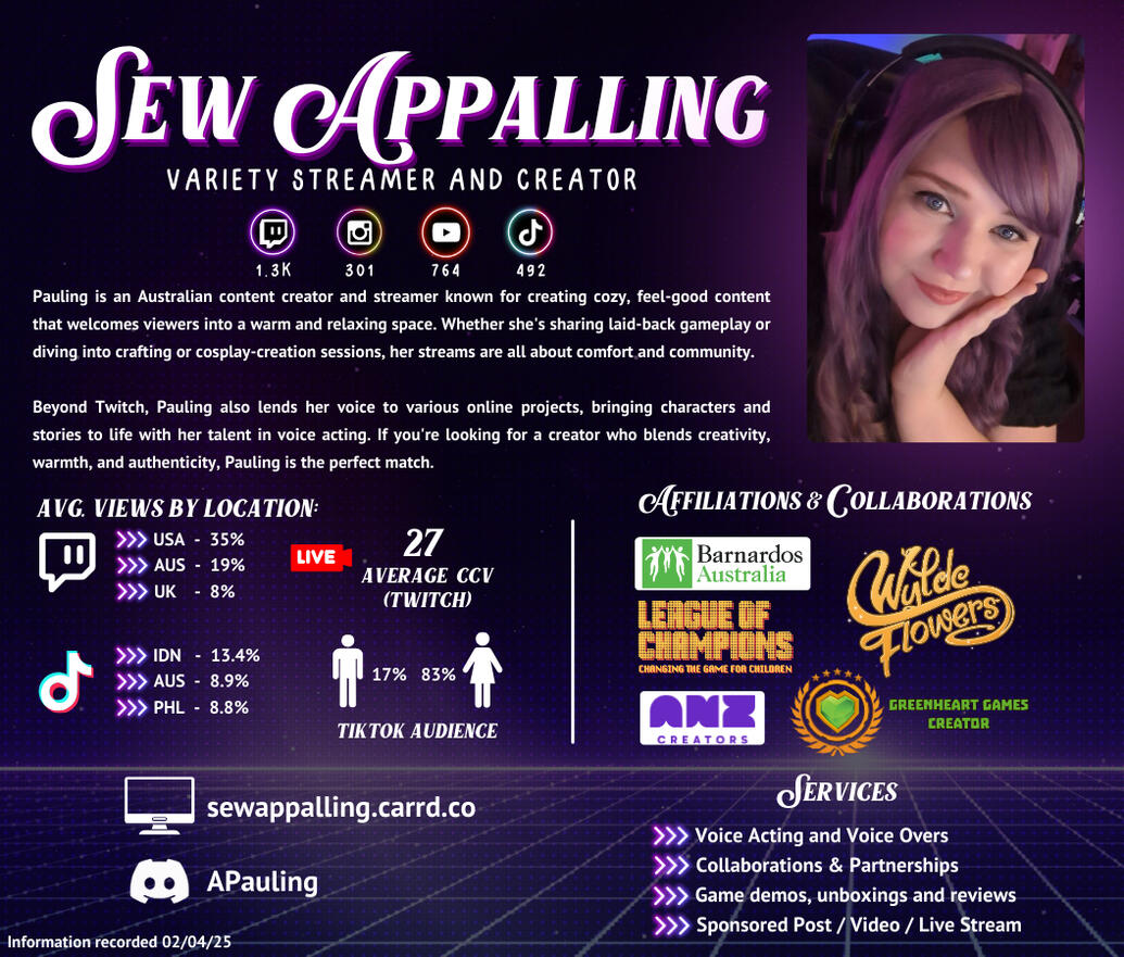 Hi! Iām Pauling (she/her). I'm a Voice Actress and variety streamer from Australia! I aim to create a cosy and inclusive space for everyone to relax, chat, and make meaningful connections. šāØš - [email protected]